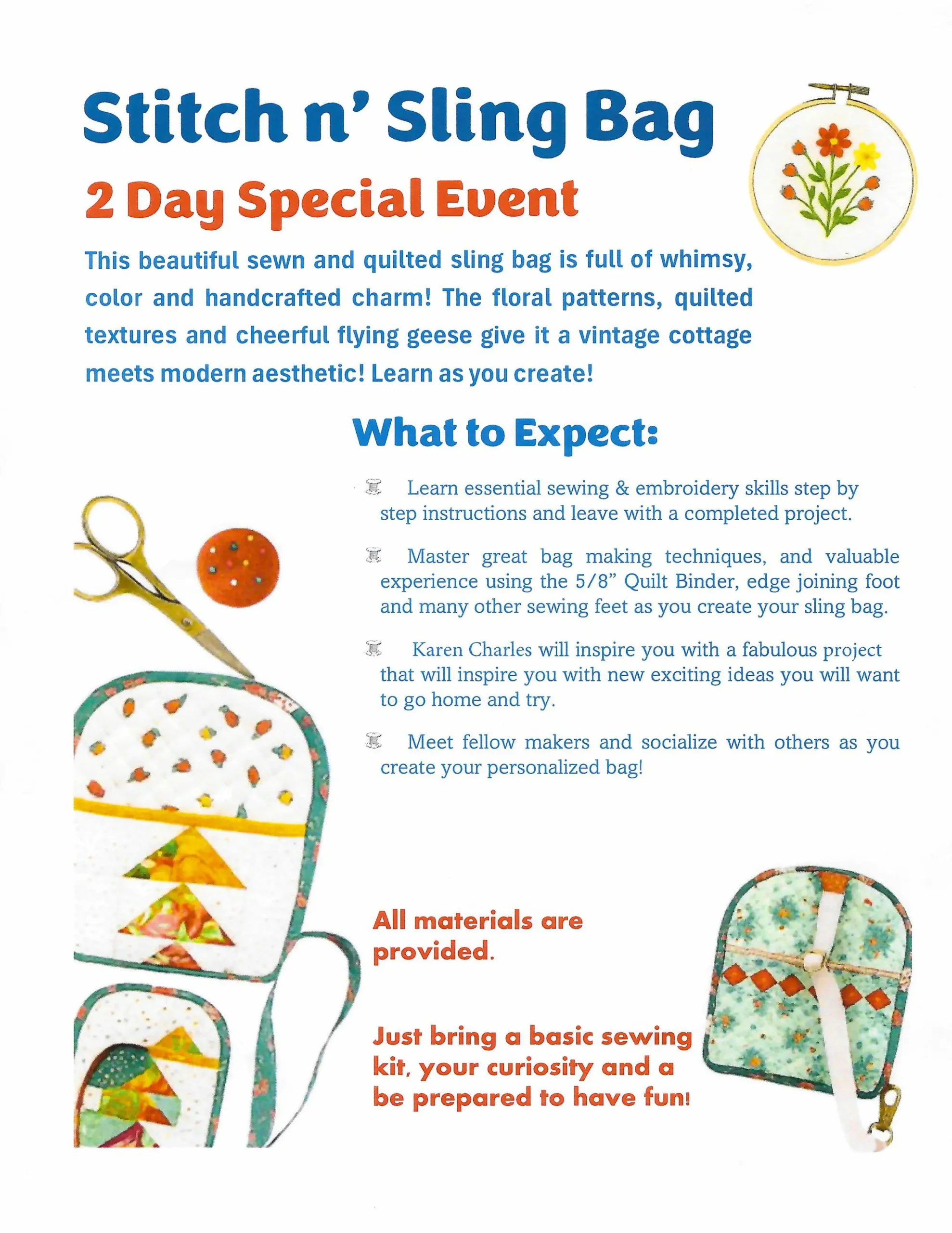 Create your very own sewn and quilted sling bag. The floral patterns, quilted textures and cheerful flying geese give it a vintage cottage meets modern aesthetic! Learn as you create!