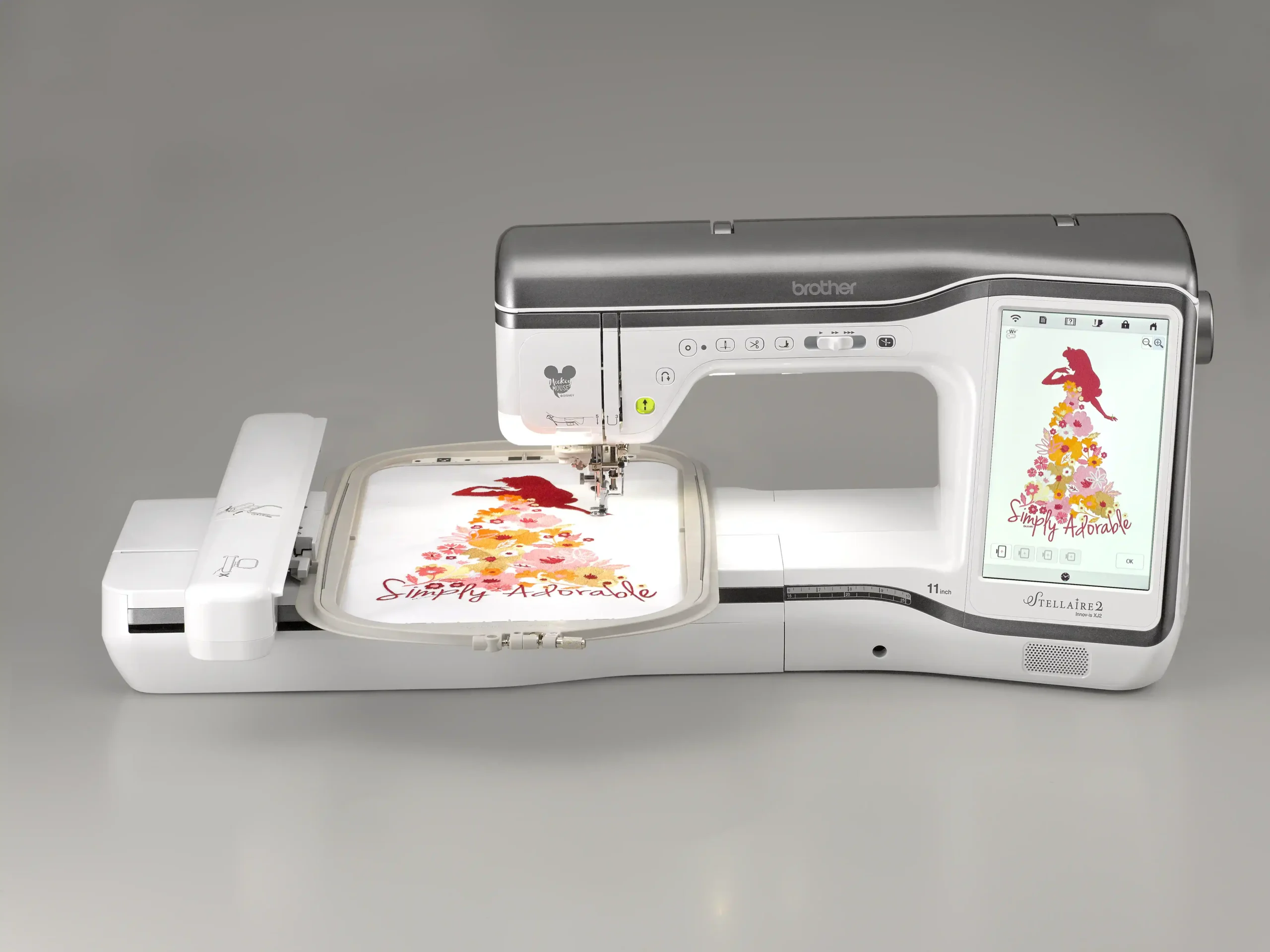 The Brother XJ2 Stellaire is a combo sewing and embroidery machine that offers over 760 built-in sewing stitches and 788 built-in embroidery designs, including 101 exclusive Disney patterns. Key features include a large 9.5" x 14" embroidery area, a long 11.25" arm, a digital touchscreen, automatic needle threading, wireless connectivity for design transfer, and an automatic thread cutter. It also includes advanced functions like a digital dual feed system for even fabric feeding, automatic presser foot height adjustment, and a quick-swap straight stitch needle plate without screws.